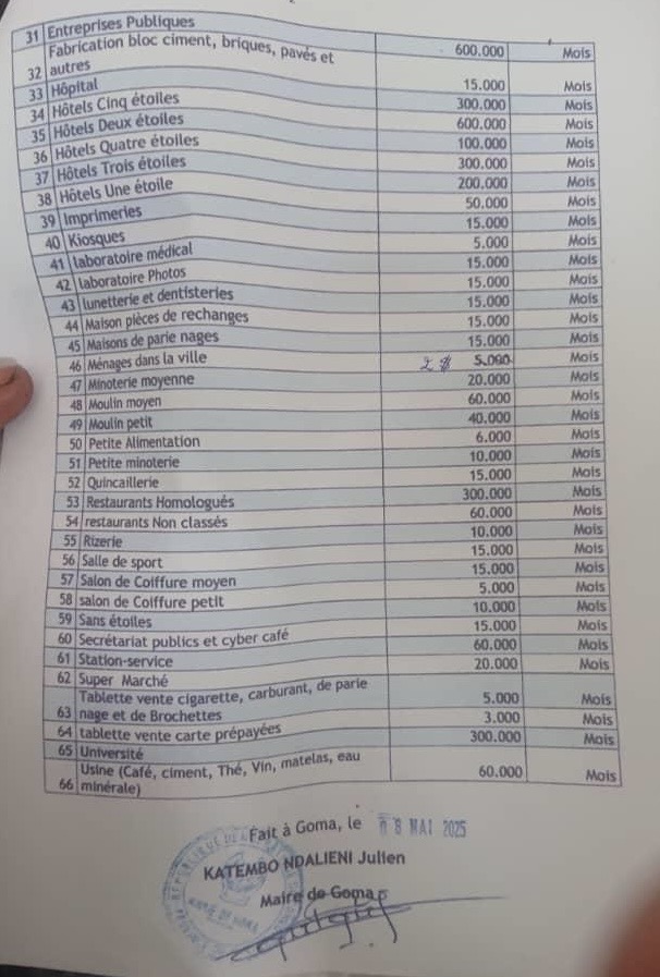 Les boucheries et charcuteries (30.000 FC), cafétéria, Nganda, Bars et Maisons de lait (10.000 Fc) et dépôts de boissons (15000 Fc).