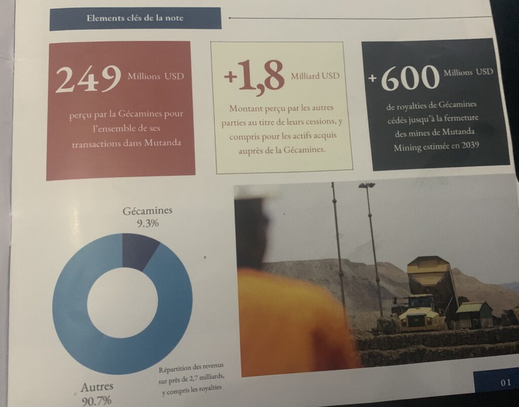 En effet, lors de la cession de 20% des parts dans Mutamba, la Gécamines n’a pas perçu que 249 millions de dollars pour l’ensemble des transactions sur le projet MUMI ( Mutanda et Kansuki). Cependant, les acquéreurs des actifs cédés avec en tête l’homme d’affaires israélien ont revendu les mêmes actifs, sans preuves évidentes d’une valorisation à plus de 1,8 milliards.